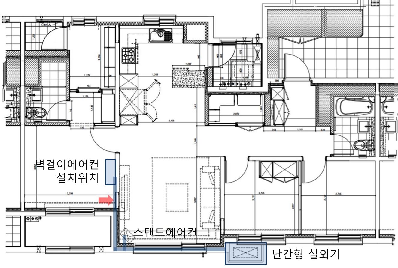 청진기에 익숙하지 않아 애먹었지만 안방에서 가장 진동음이 강하고 직접적으로 느껴지는 곳을 찾았습니다. 하기 도면에 빨간색 화살표 방향입니다.