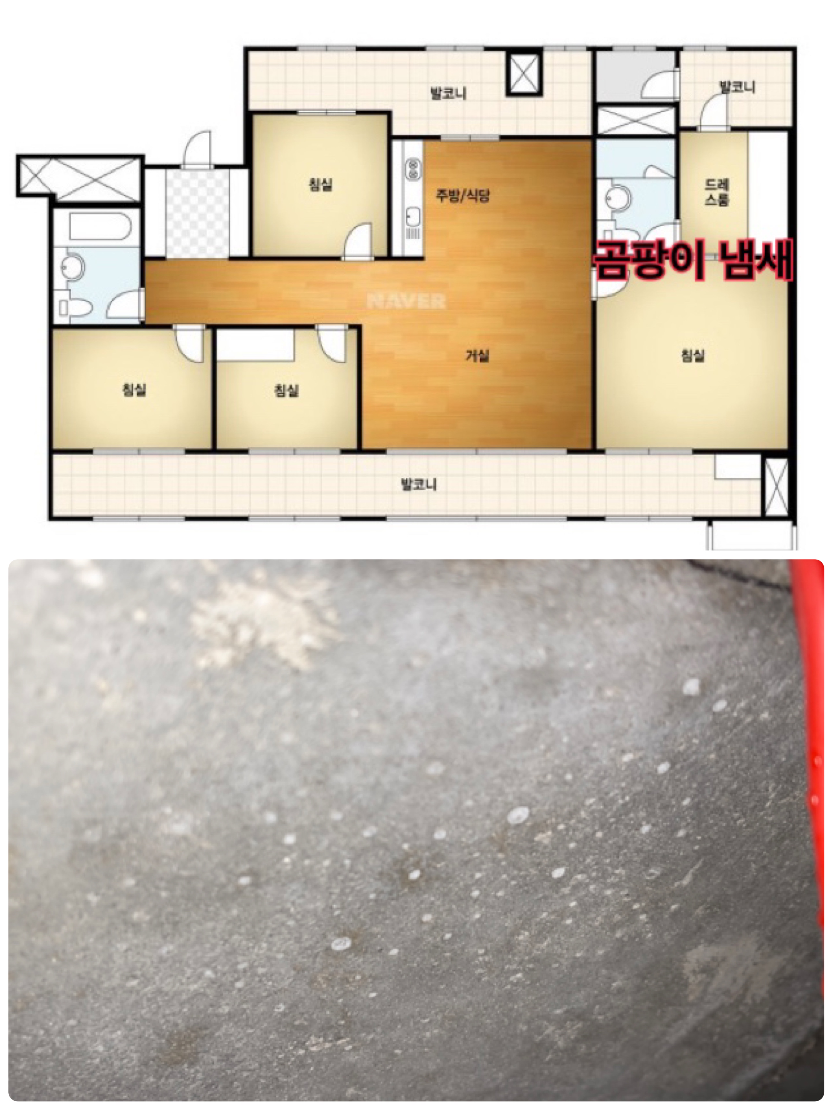 냄새로 추정되는 것은 드레스룸 천장 시멘트에 하얀색 백화자국인데 혹시 이게 물방울이 말랐던 자리가 아닐까 싶습니다. 손으로 문지르면 지워지고요.