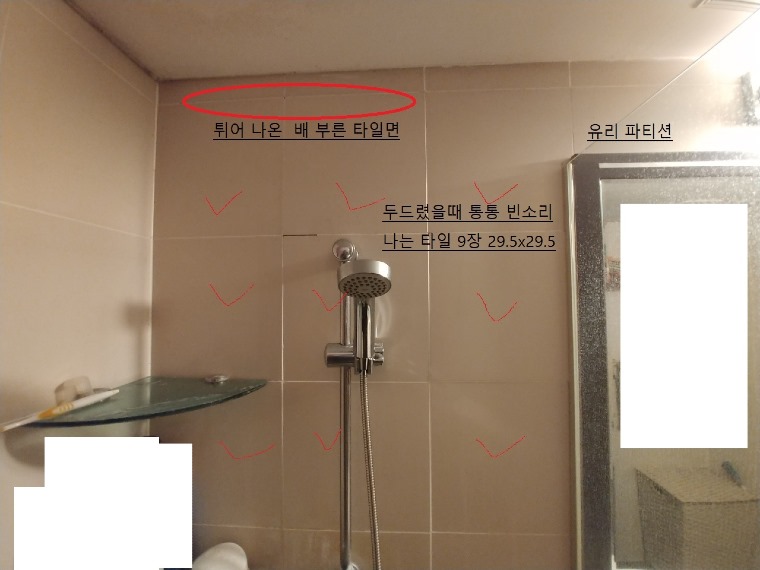 (사진의 반대쪽 벽 타일들도 통통 소리 나는게 여러장 있습니다 )