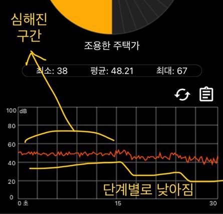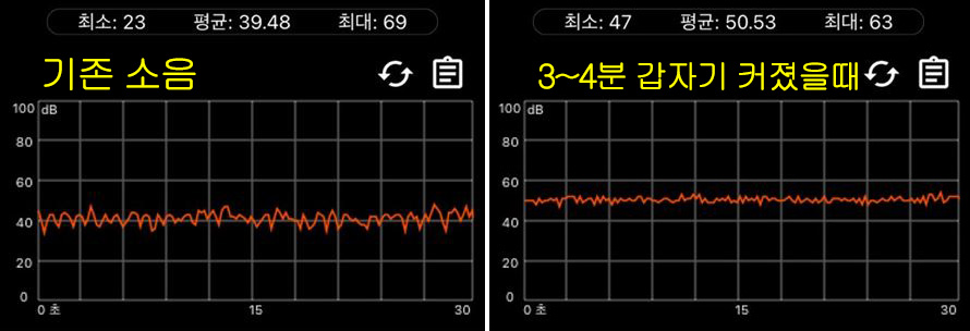 그리고 어젯밤 10시와 오늘 아침 7시50분 두차례 3~4분 정도 갑자기 웅웅 소리가 기존보다 확 커졌다가 다시 원래 소리 정도로 돌아왔어요. 기존은 40db 정도면 이 두차례는 50db정도고 기존은 웅~~웅~~ 이런 파동이면 50db이었을때는 웅웅웅웅웅 이렇게 파동이 빠른 느낌으로요.