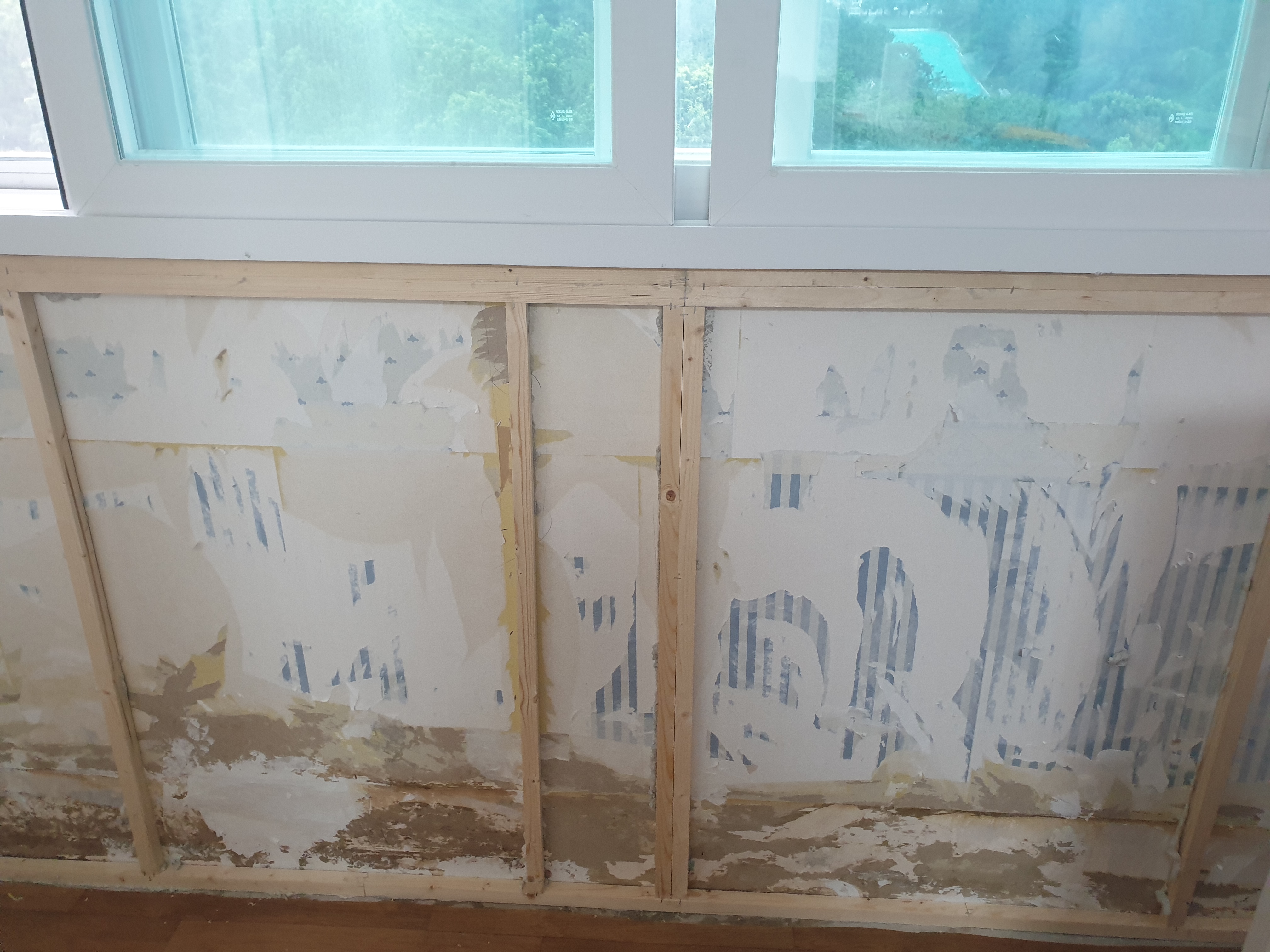 그래서 지금 앞쪽의 빈 곳은 각목을 대고 창의 무게를 받게 하던가, 철재 브라겟 시공이 되는 것이 정상입니다.