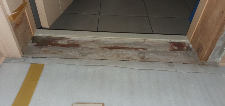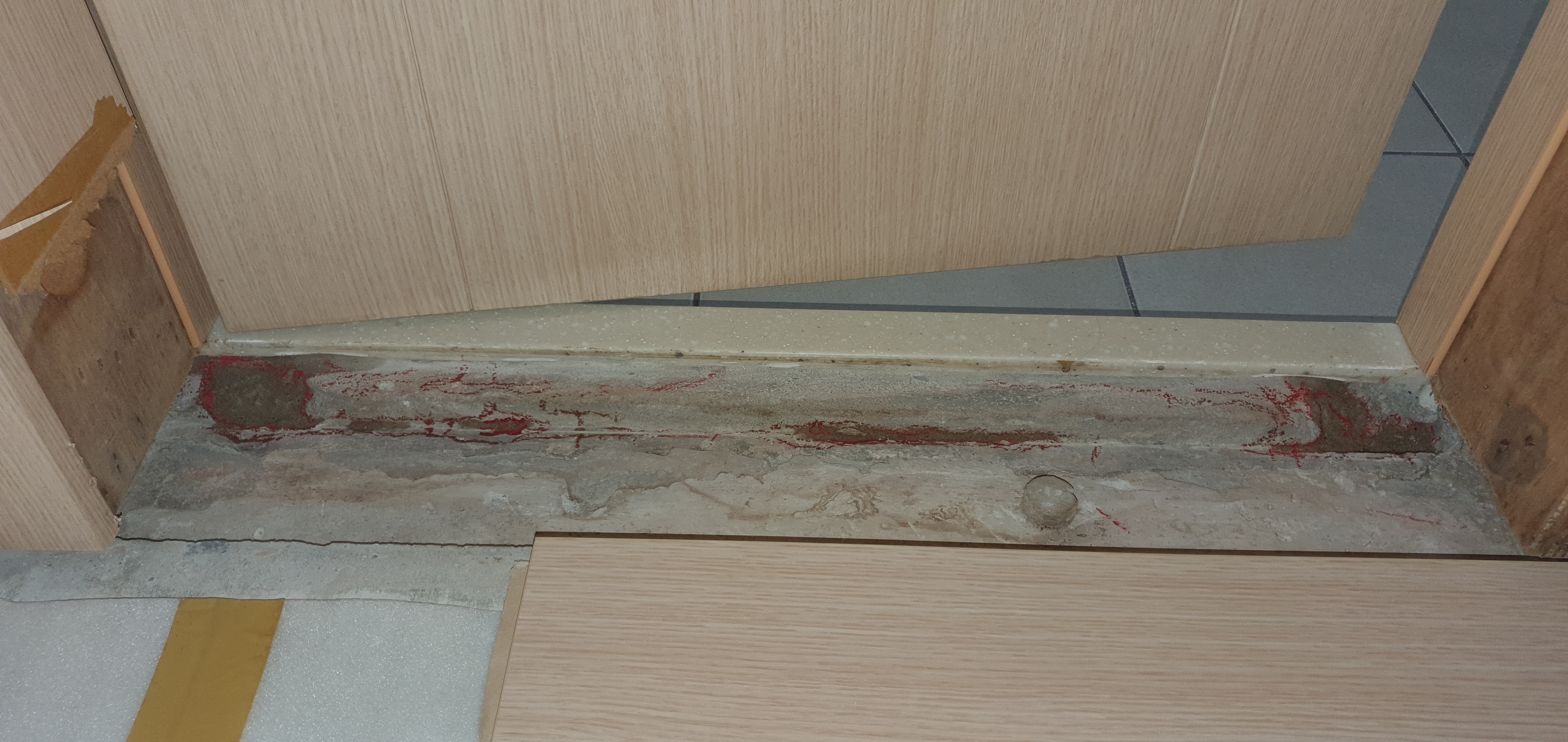 공용화장실 하단 문턱인접 강화마루가 부풀어 올랐네요.