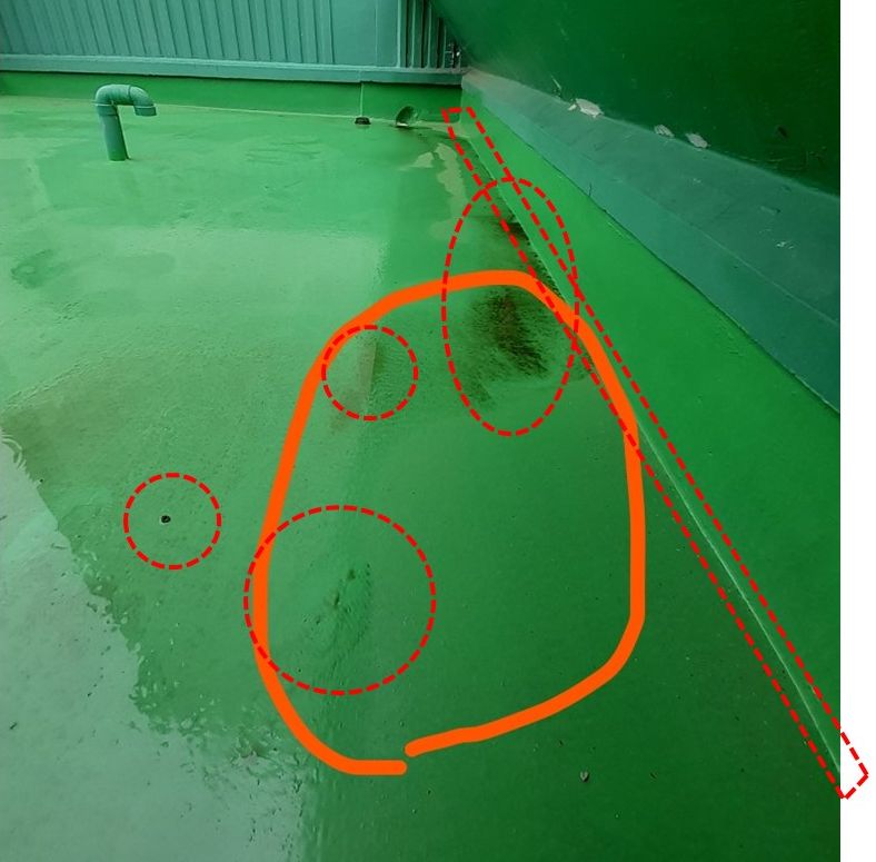 옥상에 붉은 색 동그라미를 두군데 그려 주셨는데요.. 위/아래 사진 중에서 물이 새는 쪽과 가까운 사진을 알려 주시어요.