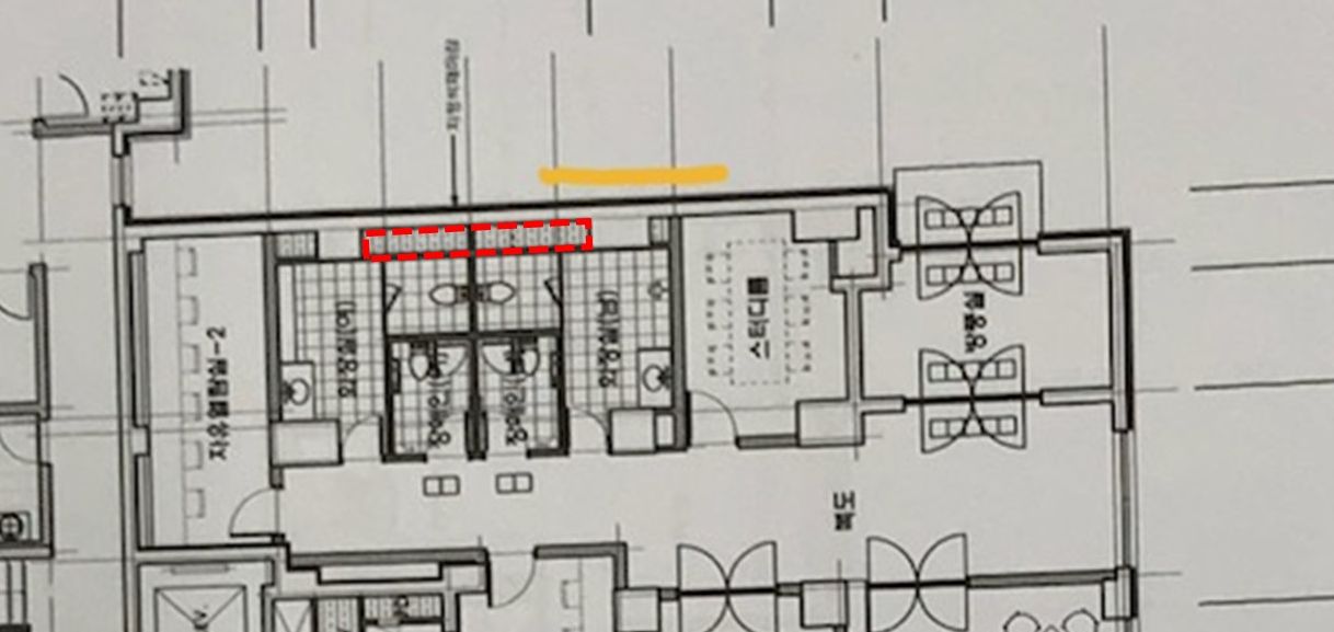 아래층 커뮤니티가 공실이라고 하셨는데요. 1층 커뮤니티 내부에는 어떤 용도의 시설인가요? 특히 안방화장실 쪽에 어떤 실이 있는지 살펴봐 주시겠습니까?