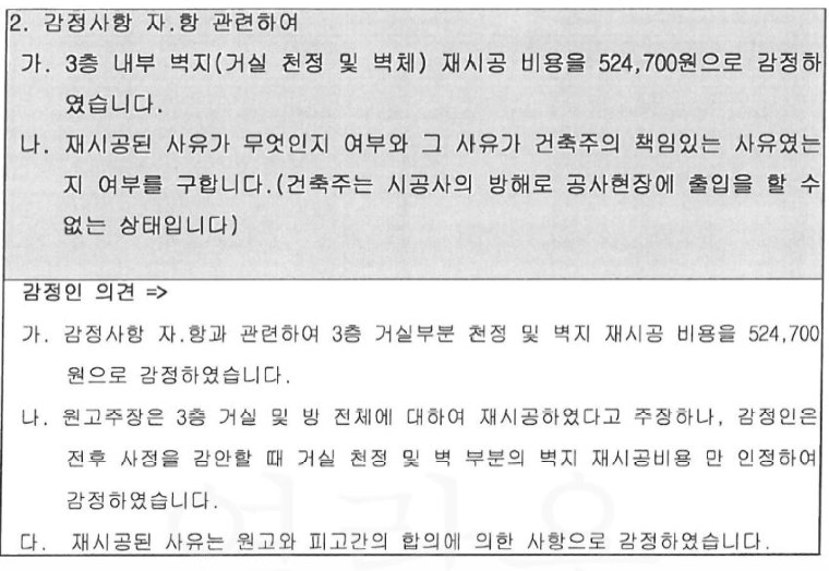감정서를 쓴 기술사는 저희와 시공사가 합의에 의한 재시공이라고 기재하고 있습니다.