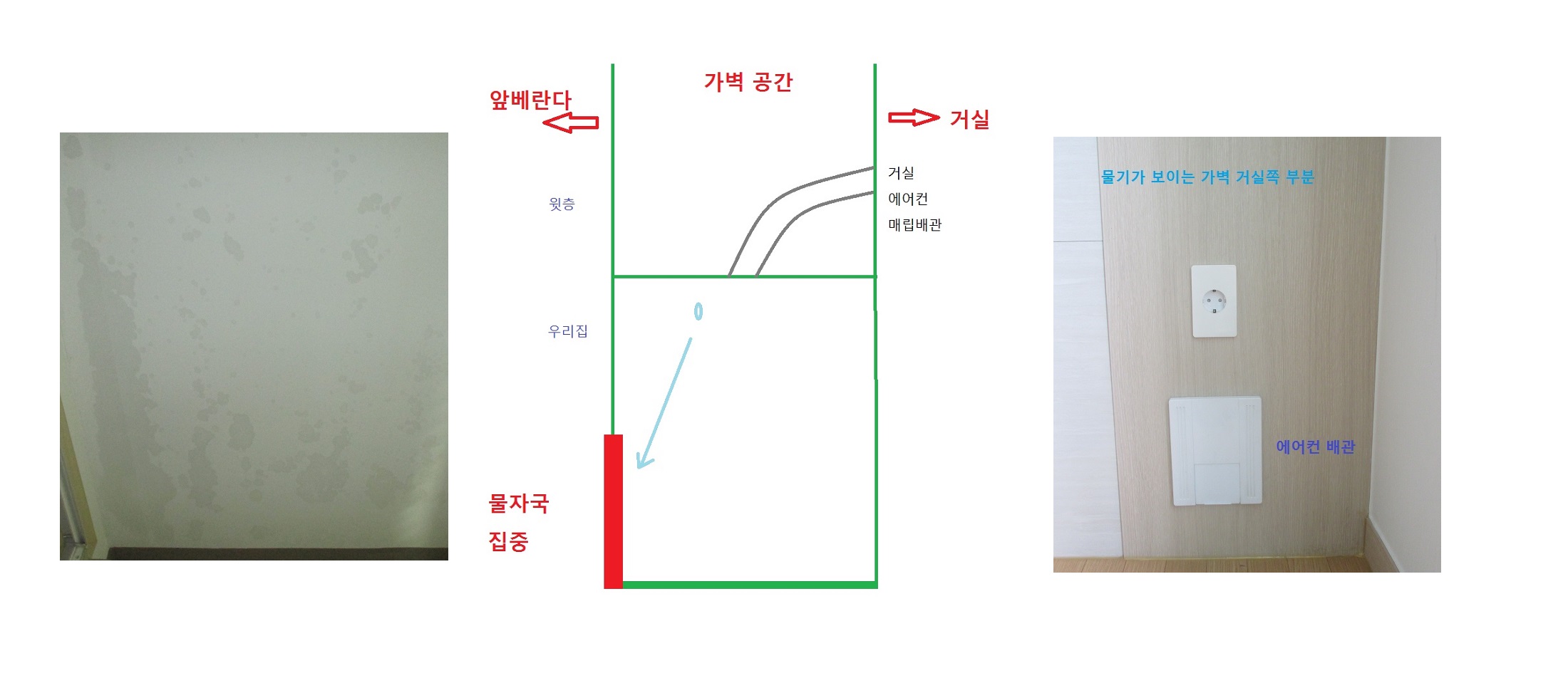 가벽은 페인트 마감입니다.  거실과 베란다 가벽사이로 에어컨 매립배관이 있습니다. 관리자님이 말씀하신대로 혹시 상층부에서 에어컨 매립배관 누수가 있는 것일까요?  물방울 형식으로 무늬가 생겨서요.