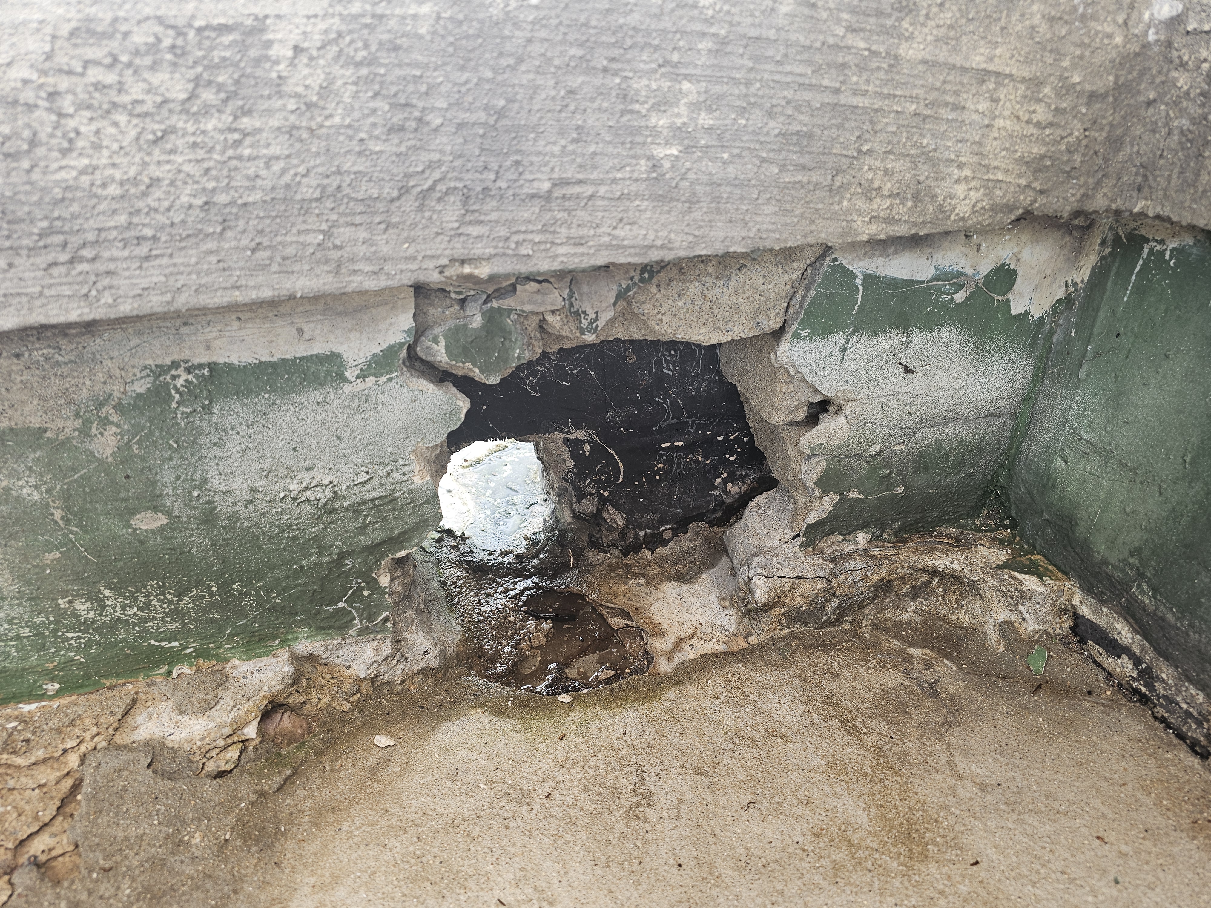 구멍 주변의 표면 몰탈을 철거하고, 구멍을 몰탈로 메운 후에 동종의 방수 제품으로 보수를 하셔야 할 것 같습니다.