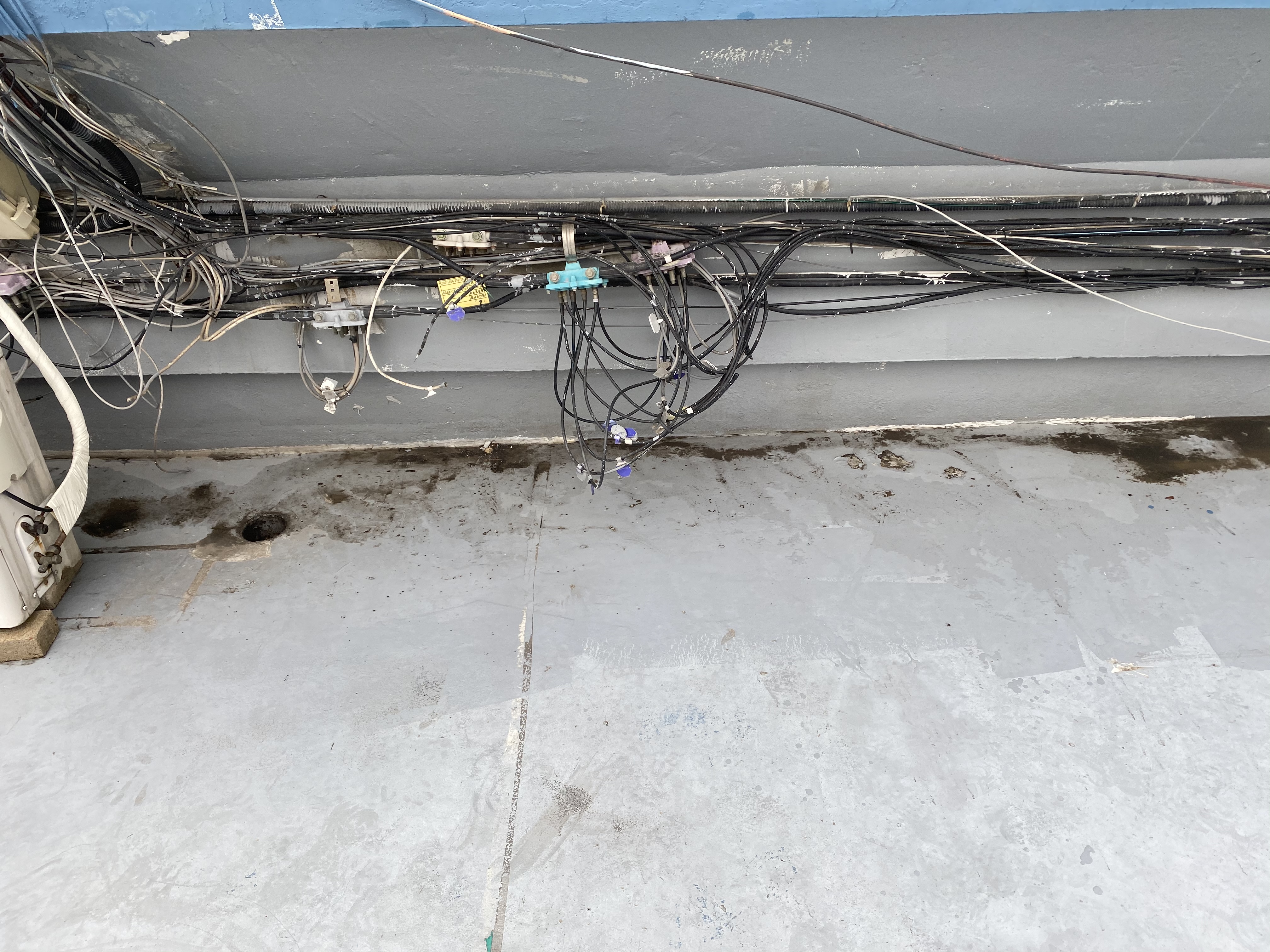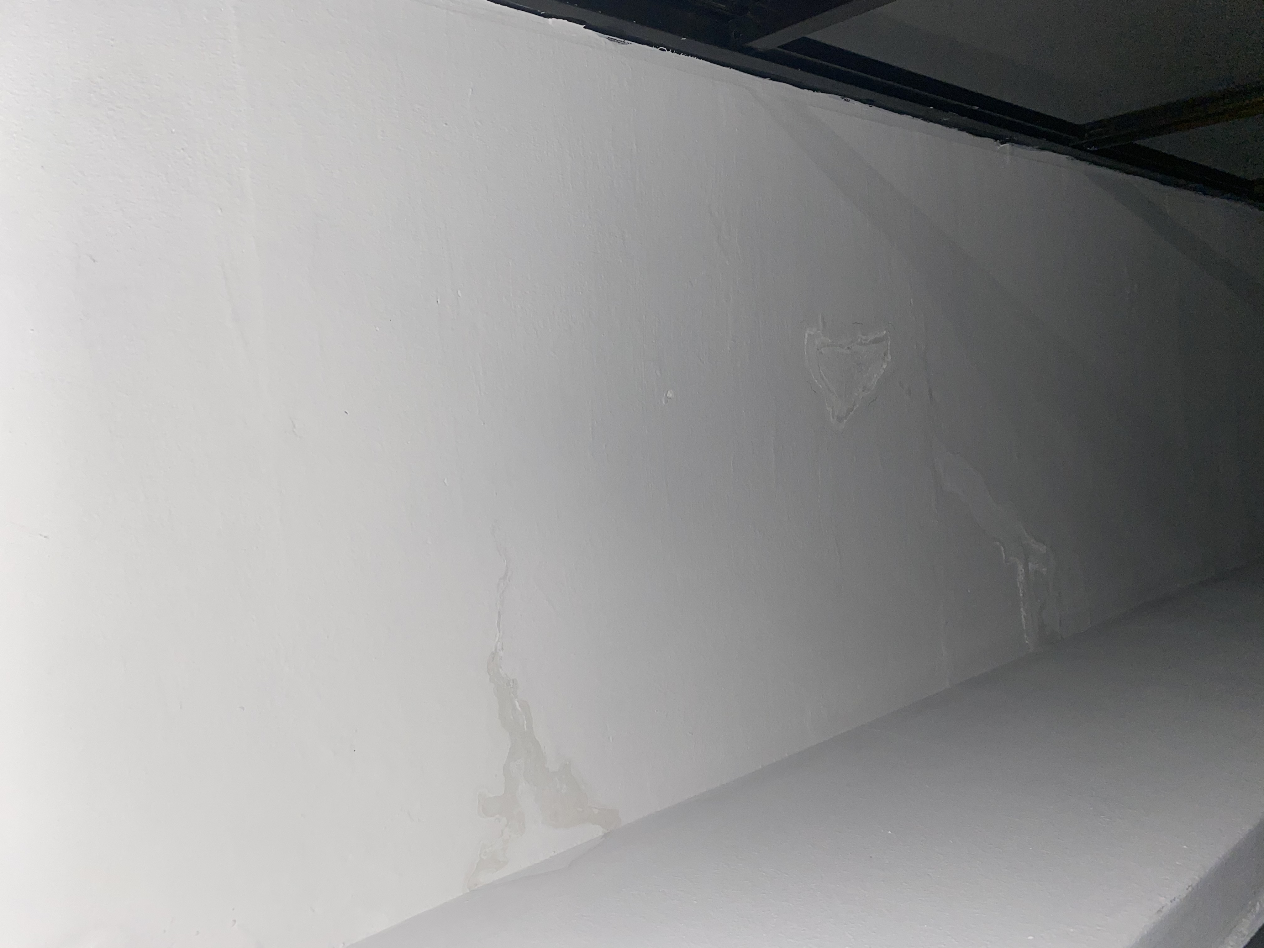 누수로 보이나, 지금의 정보로는 그 원인 (바닥,난간 등)은 판단하기가 어렵습니다.