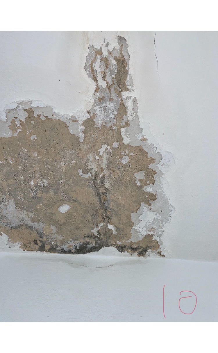 예를 들어 외부 경사벽(파란색)에 있는 작은 균열도 누수의 원인일 수 있거든요. 그 하부 끝에 살짝 물이 고여 있는 부분도 그렇습니다.