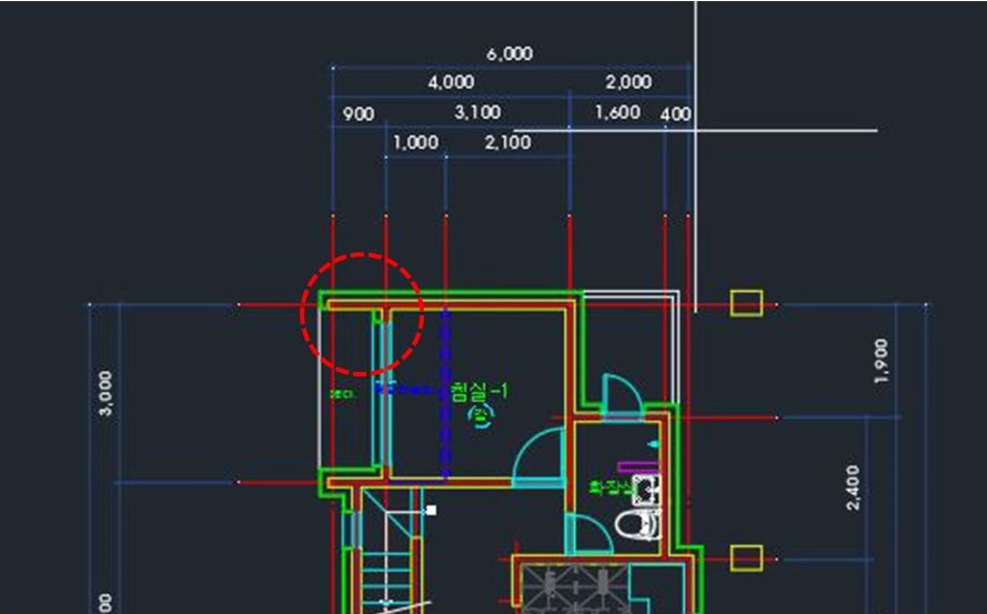 노란색이 콘크리트벽인데, 원형으로 표시한 벽체는 외기에 노출되어져 있습니다. 이 곳도 단열재가 시공되어야 하거든요.