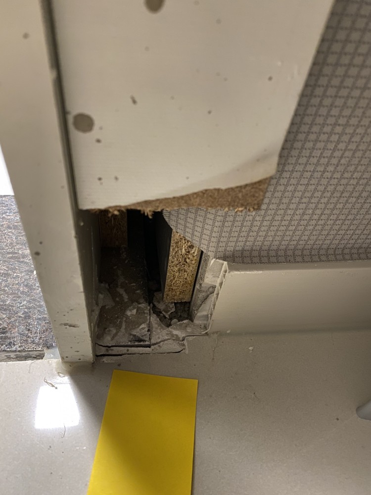 [본문] 현관부터 엉망이라서 속상한데요. 현관 타일과 현관 옆 펜트리공간으로 넘어가는 대리석 사이에 유격이 크게 보입니다. 밸런스가 맞지 않아서 마감이 제대로 안 되고 끝난것 같아요. 그에따라 펜트리 안쪽 구멍도 뚫려 있어요.