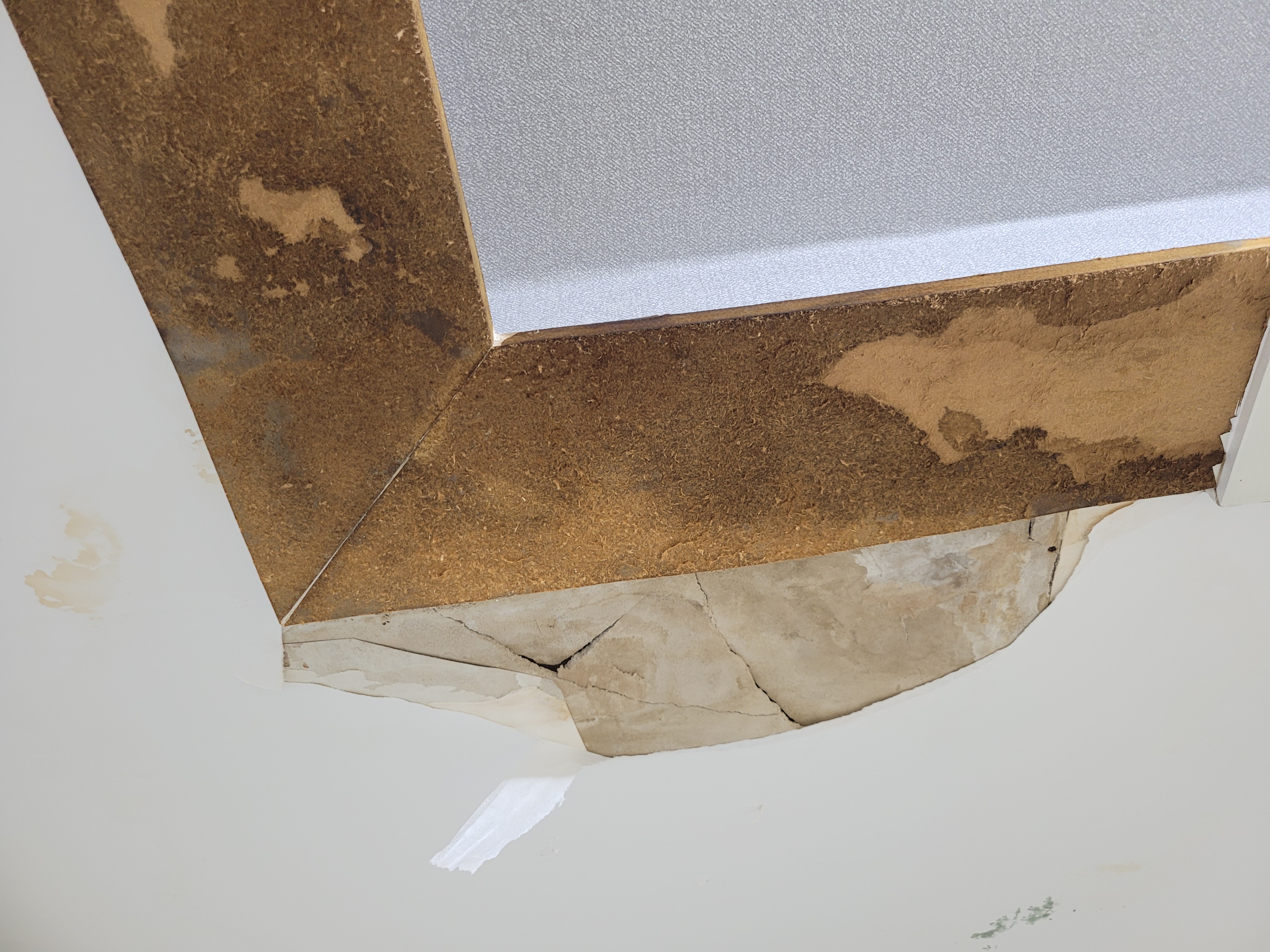 네 거실 우물천장 부근입니다.  누수가 가장 심하게 되어 벽지가 까맣게 변한 부분이라 벽지만 뜯으려 했는데 석고보드가 부스러져서 교체겸 뜯었어요