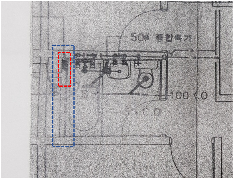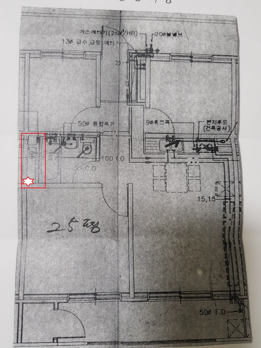 빨간표시 부분에 뭔가 표시한 부분이 있네요~ 점검구 같은것이 천정 PD공간이 아닌 타일벽에 위치해 있을수 있다는 건가요? 관리실에 한번 확인해 보겠습니다. 감사합니다~