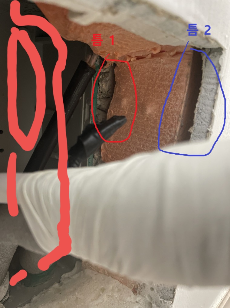 외벽면 -> 단열재 -> 석고보드 이렇게 되어 있는데 단자함 매립을 위한 석고보드와 단열재에 네모난 구멍이 있고 외벽면과 단열재 사이에 틈이 한 1cm정도 떠 있는데 이부분으로 찬 공기가 들어오는것 같습니다.
