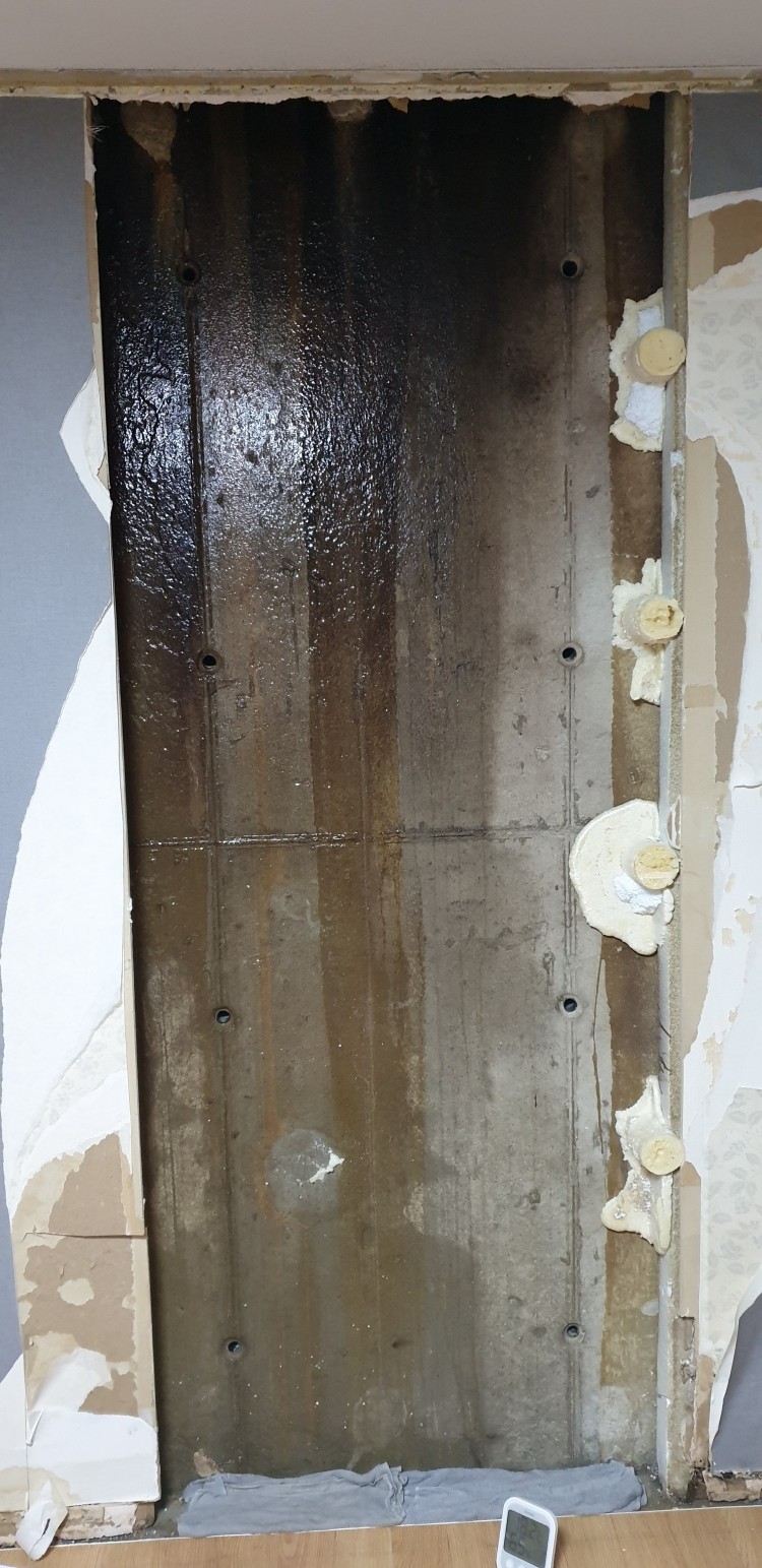 단열재까지 철거한 콘크리트면에서 물기가 계속 흐르고 있고