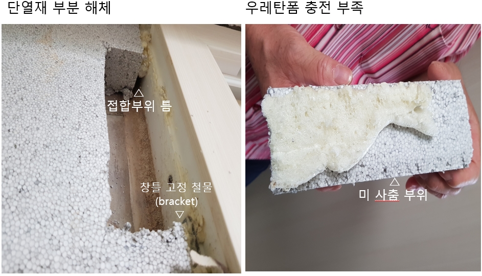 해결방법은 위에서 말씀드림과 같이 단열재와 창틀 틈새 우레탄폼 충전 시 전 단면을 밀실하게 처리함으로써 단열성능이 저하되지 않도록 해야 합니다. 또한 창틀 고정철물(브라켓)은 콘크리트 표면과 경계면에 PE 또는 합성고무 등과 같은 재질의 절연재를 붙여야 하고, 고정철물 끝단이 단열재 표면보다 20mm 이상 안으로 들어가게 설치한 다음 단열재보다 들어간 부분은 우레탄폼으로 충전해야 합니다.