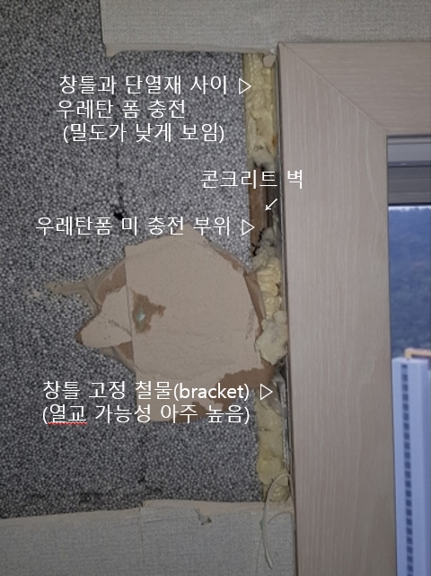 두 번째는 '스티로폼 단열재와 창호 사이에 폼을 쏘아놓긴 했는데 겉에만 대충 쏘아져있고 안은 텅 비어있었습니다'라고 하신 것으로 보아, 전 단면이 채워지지 않았기 때문에 국부적인 단열 결손으로 인한 단열성능 저하입니다. 거기에 더하여 제가 편집한 사진에서 표시한 것과 같이 중간에 우레탄폼 충전이 생략된 부위도 이와 다르지 않습니다.