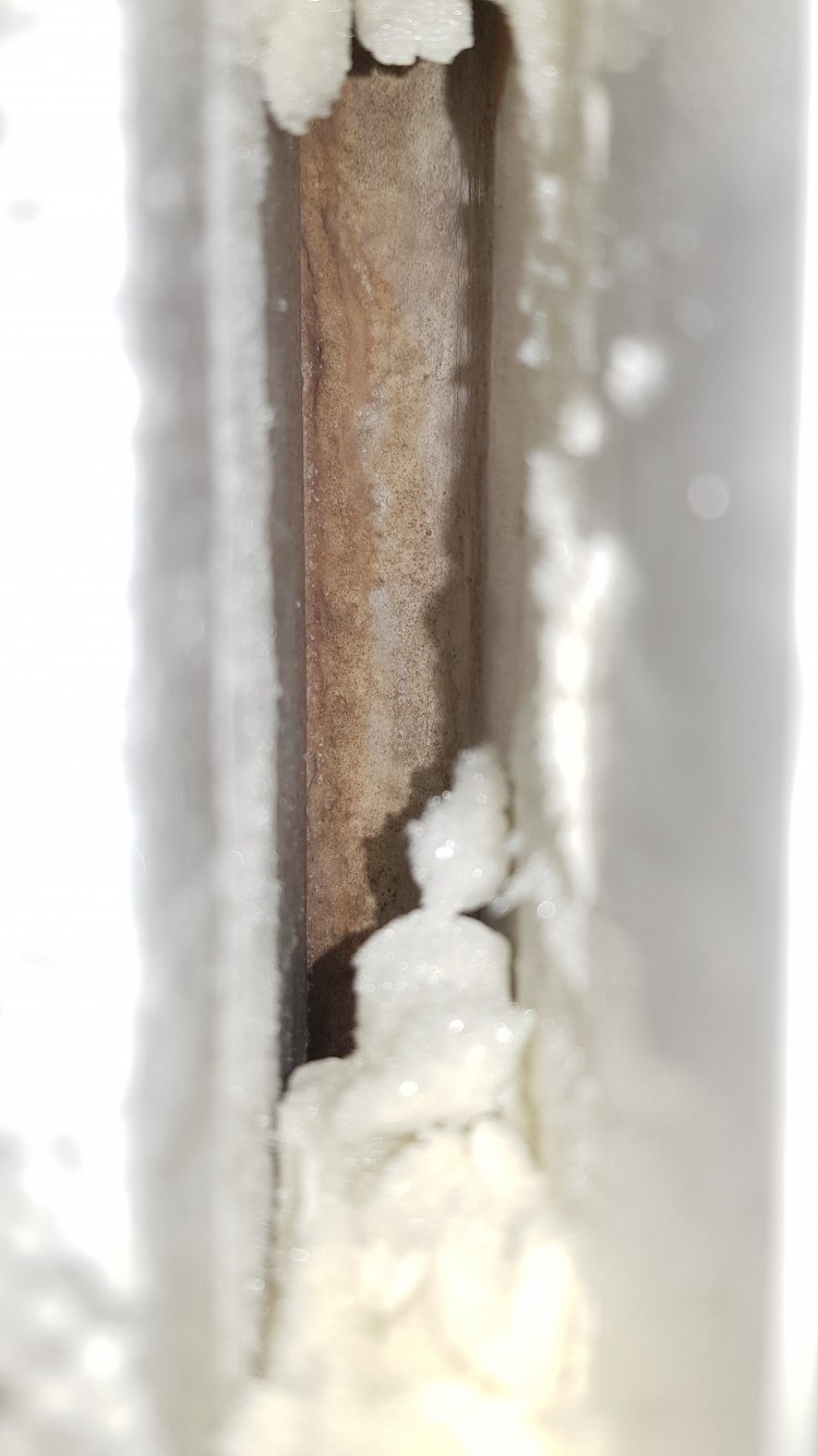 첫 번째는 단열재와 창틀 사이 틈을 충전한 우레탄폼의 밀도가 너무 낮게 보입니다. 이러한 틈새는 우레탄폼 충전 시 단열재 전 단면을 채우고, 폼이 팽창할 때 합판 조각 같은 널판지로 눌러줌으로써 공극이 줄어들어 밀실하게 됩니다. 그러나 그렇게 시공하지 않음으로써 해당 부위 단열성능은 저하될 수밖에 없습니다.