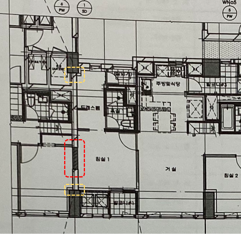 이유는 알 수 없지만, 세대간벽 중간에 건식벽체(또는 조적벽)이 존재합니다.