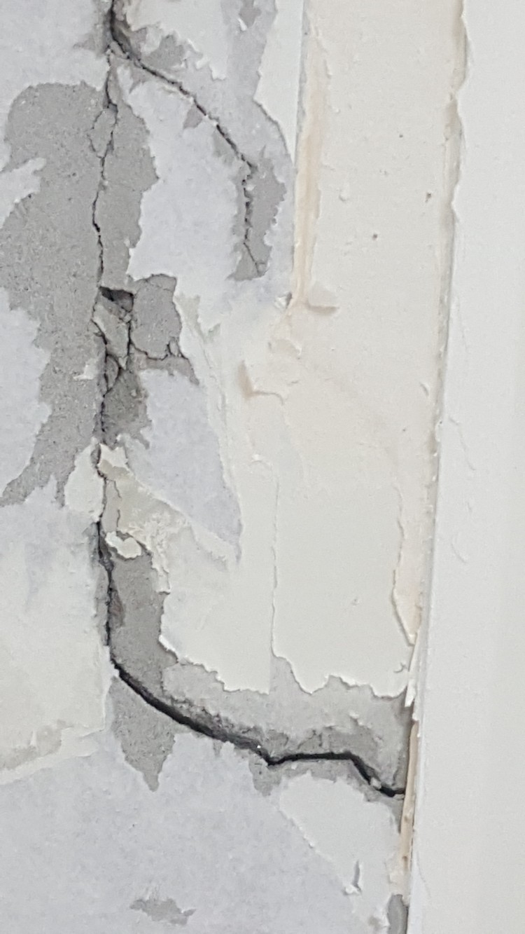 제 추측이 맞는다면, 이는 구조균열이 아니기 때문에 질문하신 내용과 같이 균열 보수재나 퍼티로 틈을 막아도 문제는 없습니다. 한편, 외측에도 동일한 균열이 발생했을 것입니다만, 외단열 또는 치장벽돌과 같은 외장재에 의해 감춰졌을 것입니다.