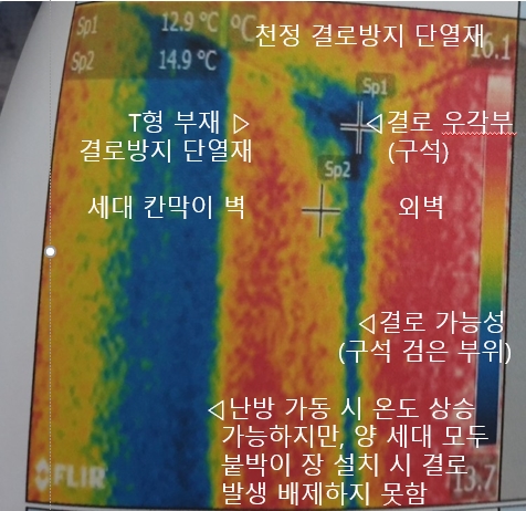 위에 제시된 열화상 카메라 이미지만 봐서도 결로 우각부인 Sp 1의 온도는 동절기 일반적인 노점온도 기준을 넘어서고, 그 하부인  Sp 2의 온도는 곰팡이 발생 온도를 초과합니다. 저런 상태에서 현재 위치에 붙박이장이 들어선다면 결로와 곰팡이 발생은 피할 수 없을 것으로 여겨집니다.