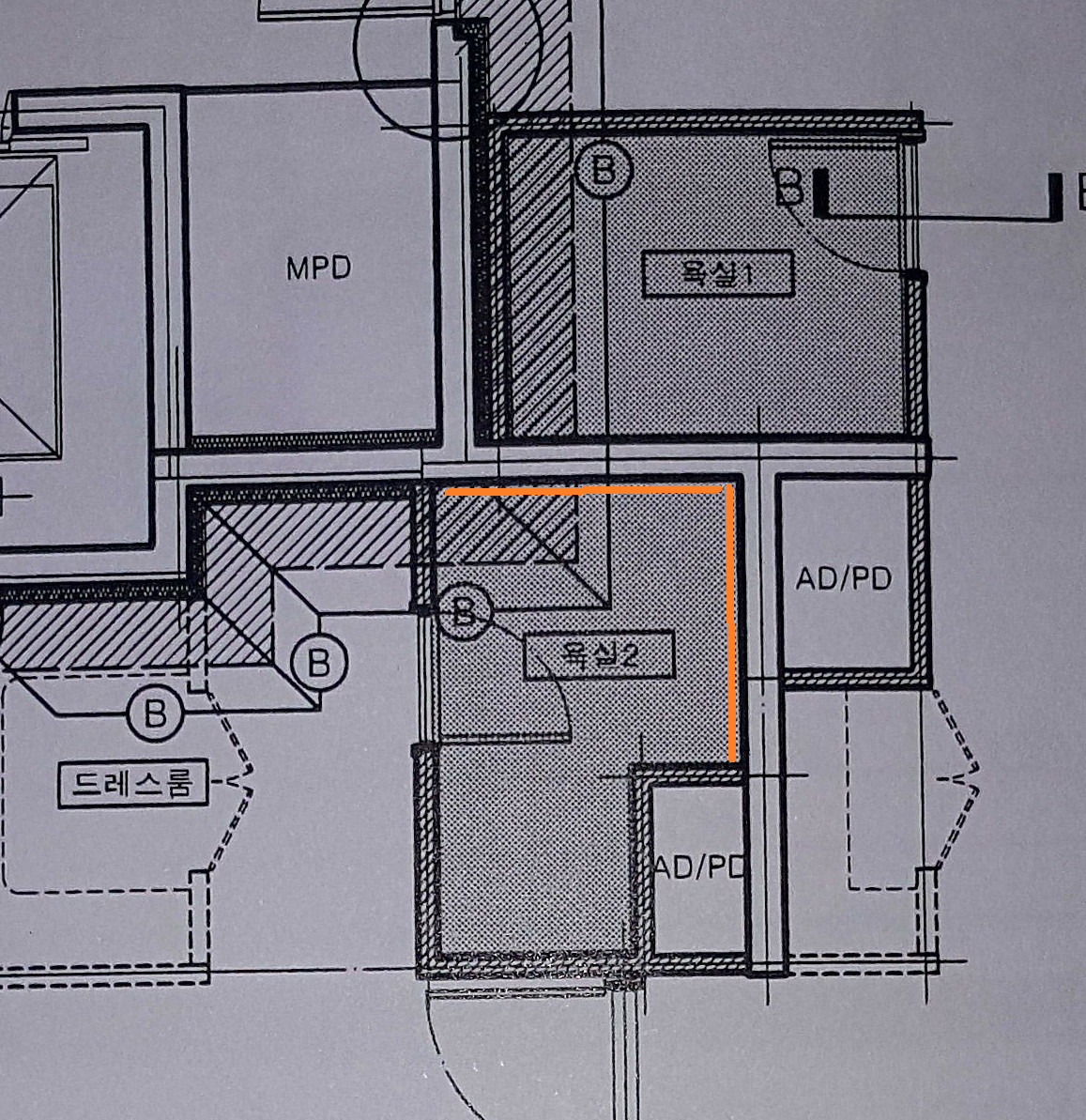 공용욕실과 AD/PD 반대벽면에만 결로가 발생합니다. 마주보는 공용욕실벽면은 아주 깨끗합니다.
