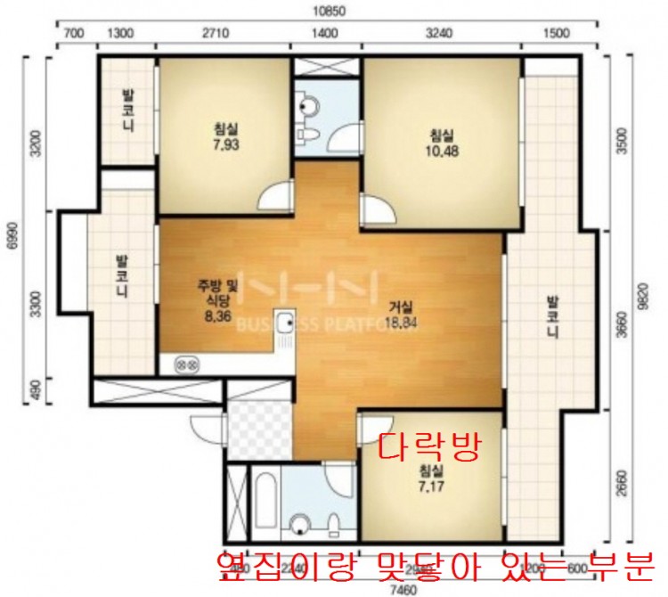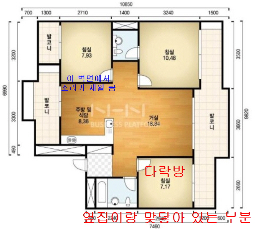 다만, 여러 벽 중에서도 옆집과 붙은 벽 보다 사진에 표시한 주방쪽 벽에서 소리가 제일 크게 들려서 놀랬습니다. (그리고 저 벽에서 엘리베이터가 움직이지 않을 때도 웅~하는 소리가 랜덤으로 나는데 미스테리입니다. 저 벽 바로 뒤에 인터폰, 두꺼비집, 인터넷선 연결박스?!가 있는데 관련이 있을까요?)
