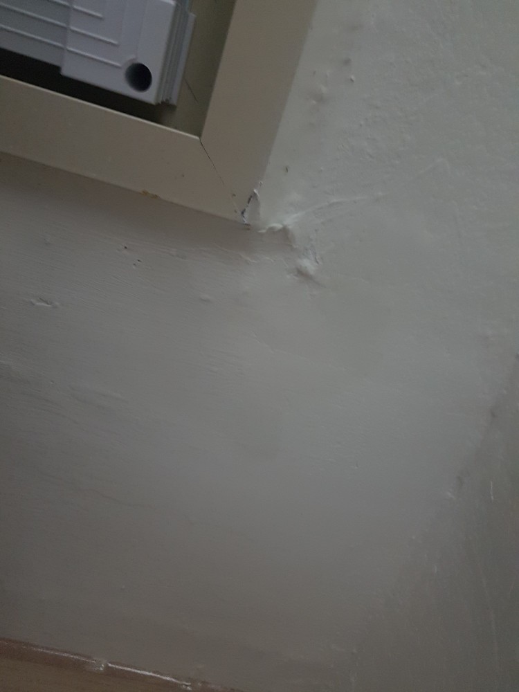 상기하자는 창틀 배수구로 나가지 못한 소량의 물이 갤러리 창의 코너 이음매와 창틀 고정을 위해 타공된 부위를 통해 소량 누수되어 발생한 것으로 추정됩니다.