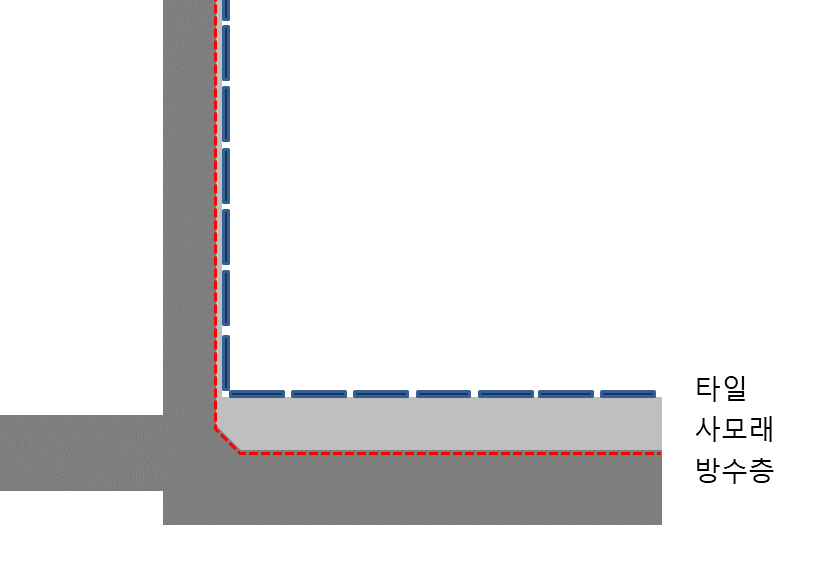그림처럼, 화장실 방수는 타일 바로 아래에 있지 않습니다. 이른바 구배를 잡기 위한 사모래층의 아래에 있으므로, 일이 좀 복잡합니다만 이 사모래층까지를 모두 들어내고 작업을 다시 해야 합니다.