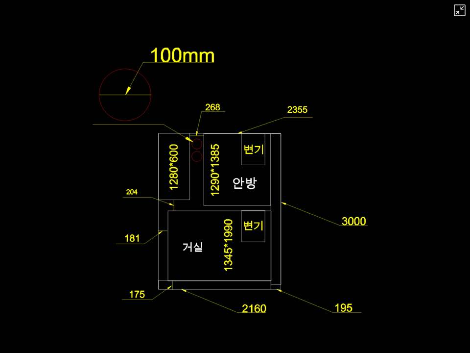 현재 저희가 살고있는 공간은 위 도면과 좀 달라서 오늘 실측해보고 도면을 작성했습니다. 관리자님게서 답변을 주셨는데 이렇게 부랴부랴 다시 도면 정정해서 올립니다.