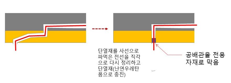 전선 부분은 아래 그림처럼 해주세요. 공배관 안으로 실내 공기가 들어가지 않아야 하므로, 전용자재를 사용하셔야 합니다. (자재정보 - 프로클리마 참조)
