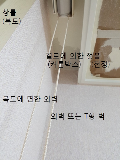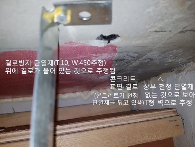 그러나 T형 칸막이벽으로 보이는 것은 복도와 직교하는 벽 상단 천정에 결로방지 단열재가 설치되어 있지 않기 때문에 그렇게 추정하는 것이며, 결로발생 원인은 단열 미비인지 사용상의 문제인지는 알 수가 없습니다.