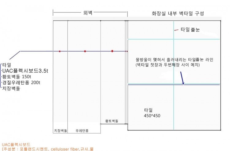 현재 증상은 1층 화장실 내부 벽타일 첫장과 두 번째장 사이 타일줄눈에서 미세하게 물방울이 맺혀 흘러내리는 증상이 한달여 전부터 발생하였답니다