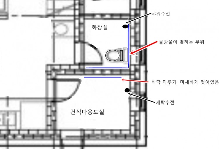 마루부분의 젖는 부분은 방수층의 문제 일수가 있는것 같은되요.그리고 양변기 뒤 타일 부분의 물방울은 변기의 물탱크 물 온도가 양변기를 통해 욕실 내로 전달 되고 그기서 생기는 온도차로 물방울이