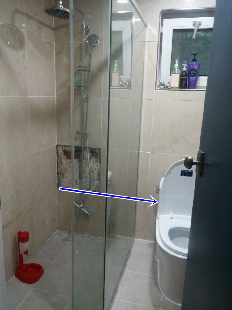 좌측의 샤워수전 앵글밸브는 상단에 위치하고  있는데 ,  설비공사를 하신 분이 배관누수를 의심하고 샤워수전쪽 타일을 제거하고 살펴 보았으나 배관누수 증상은 없다고 결론내린 상태입니다
