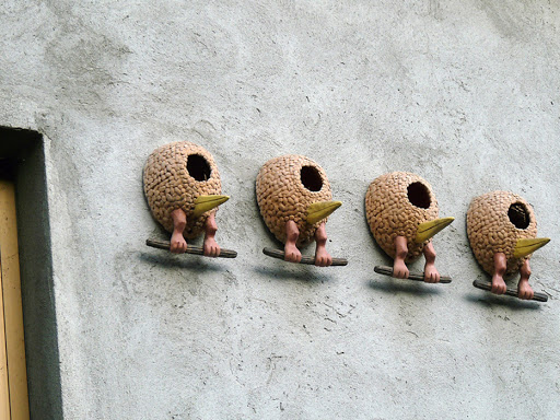 가짜 새를 만들어서 놓던가 아니면 바람에 따라 움직이는 그런 조형물 혹은 전등을 이용해서 변하는 그런 것을 만들면 일단은 방지에 효과가 있다고는 한다. 해서 아래의 사진에서도 그런 가짜 새를 입면에 고정시켜 놓은 것이 보인다. 이미 30개가 넘는 구멍이 발생한 이후이다.