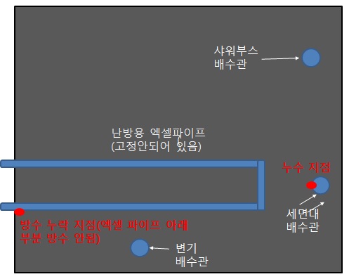 저희집 구조는 1층은 철콘이며, 2층은 목조입니다. 그림에서 보시면, 물이 처음샌곳은 엑셀파이프구멍이 있는 지점인데, 실제 1층 천장에서 물이 새어나온곳은 엑셀파이프 타공지점 맞은편 세면대배수관 타공지점이었습니다.