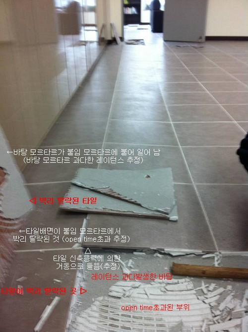 방바닥 모르타르 타설 시 과다한 물 시멘트비(W/C ratio)로 인해 레이턴스가 발생하여 모르타르 표면층의 강도가 낮기 때문에,  타일 배면 붙임모르타르에 바탕 모르타르 일부가 붙어 떨어지는 것으로 보여 집니다.