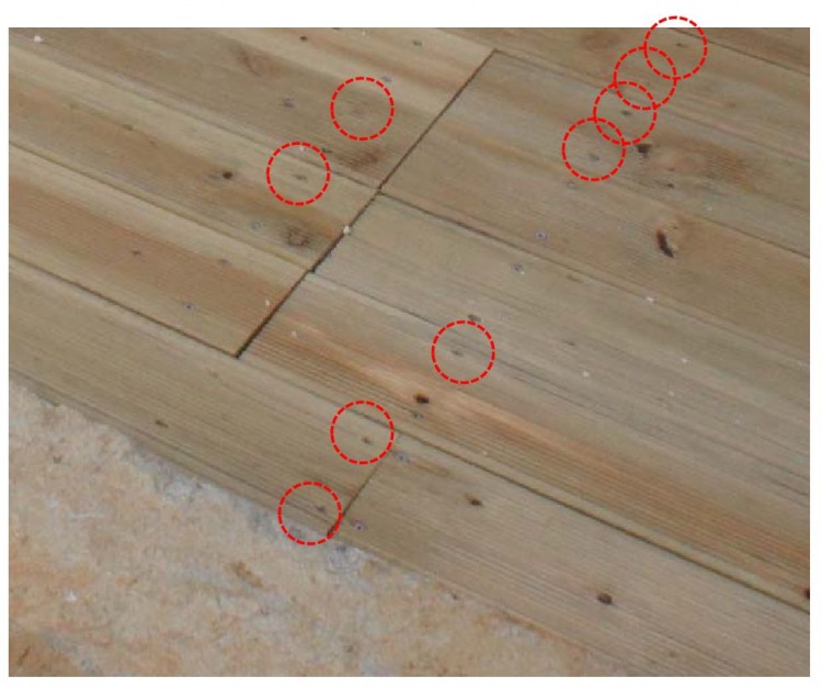 저런 상태면 얼마 지나지 않아 하부 장선에 박힌 못이 뽑혀져 올라와 마룻널이 덜컹거릴 겁니다.