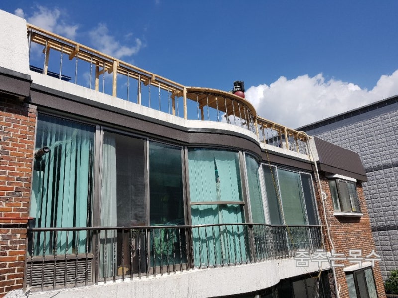 2. 바닥면을 계단 한 칸 정도(약 10cm) 한 번 올린지라 (콘크리트인지 몰탈인지 모르겠습니다) 난간 아래쪽 파라펫의 높이가 높지 않습니다.