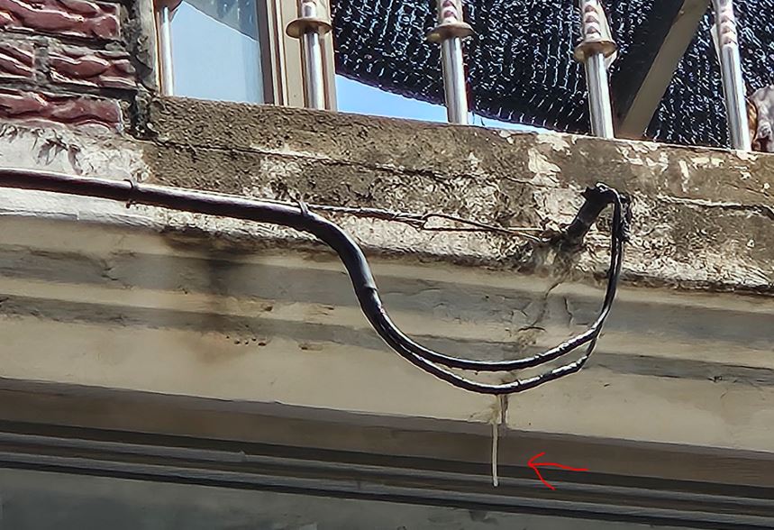 저곳을 어떻게 처리해야 하는지요? 일단 한전에 문의는 해놨지만 검색해보니 전기업자를 불러야 하는 거 같습니다. 그런데 관이 벽에 아예 들어가 있어서 관의 각도를 조절하긴 어려워 보입니다. 빗물이 주입되지 않도록 저기에 실리콘 같은 걸 쏴야 하는지요?