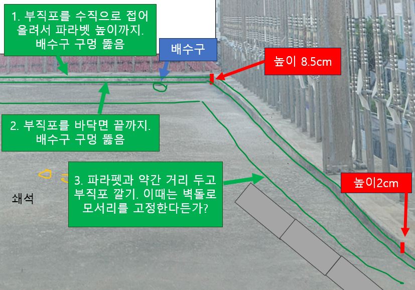 1번. 부직포를 파라펫 높이까지 접어올려서(배수구 구멍 내줌)