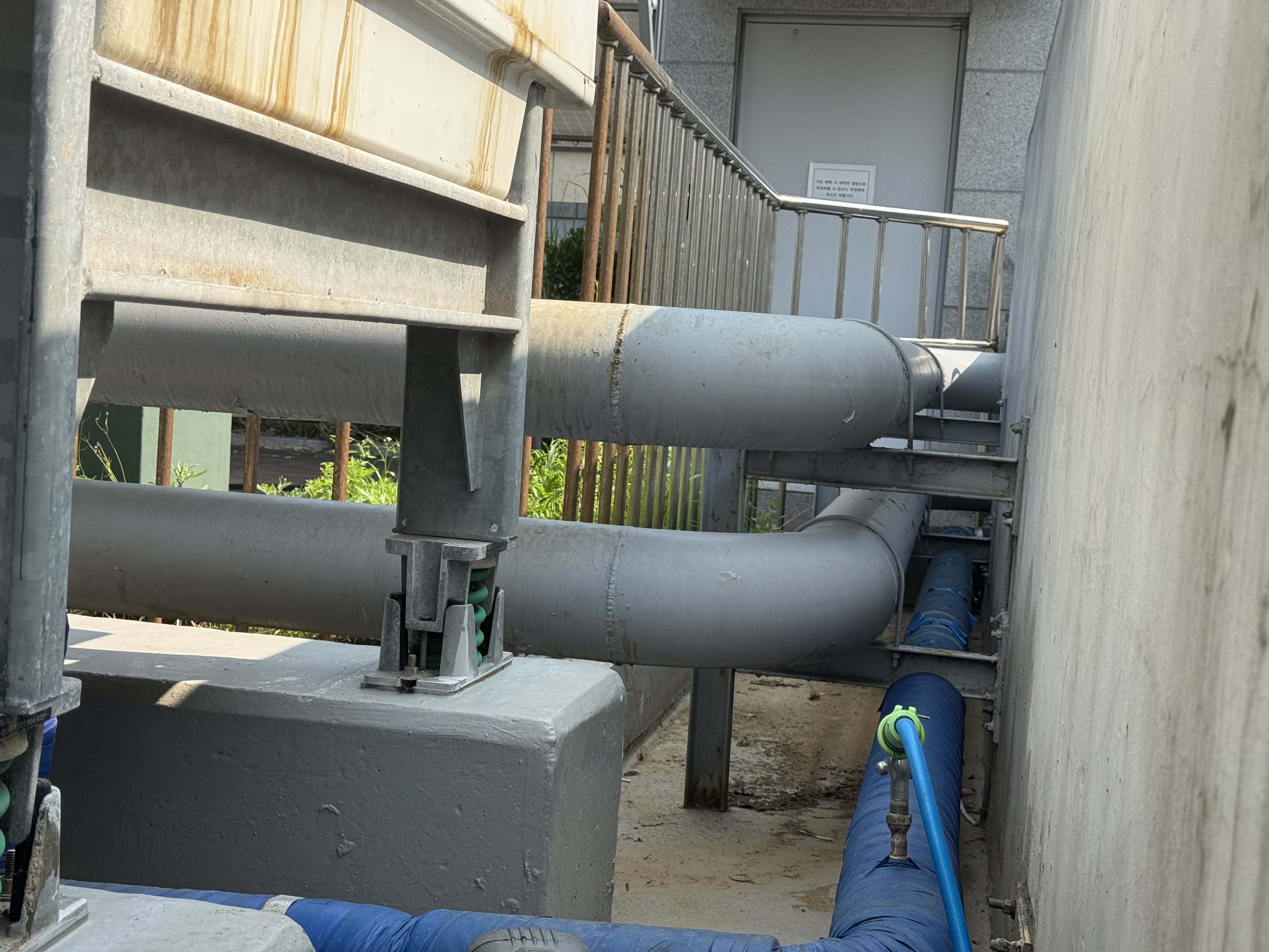 다만 해결을 위해서는 이 배관의 고정, 흡음재 시공, 틈새막이 등등의 조치가 따라야 하는데 그 것이 가능할지는 의문입니다. 필요에 따라서는 일부 구조체에 손을 대야 할 수도 있거든요.