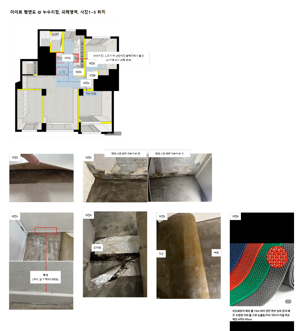 -. 사진 1, 5: 피해 구역 전반에 습기 존재, 빨간색·초록색 곰팡이 확인