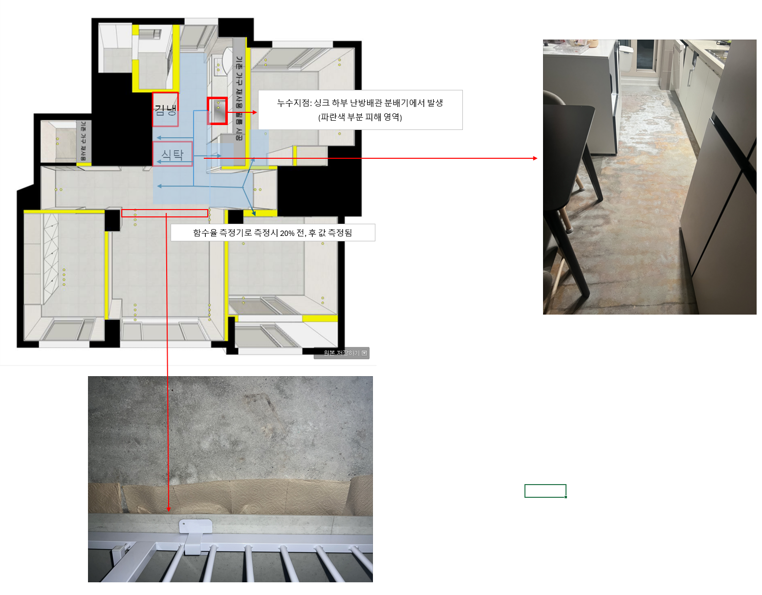 -. 25년 10월 초 싱크대 쪽 장판 울음·변색 발생 → 누수탐지 업체 통해 누수 확인