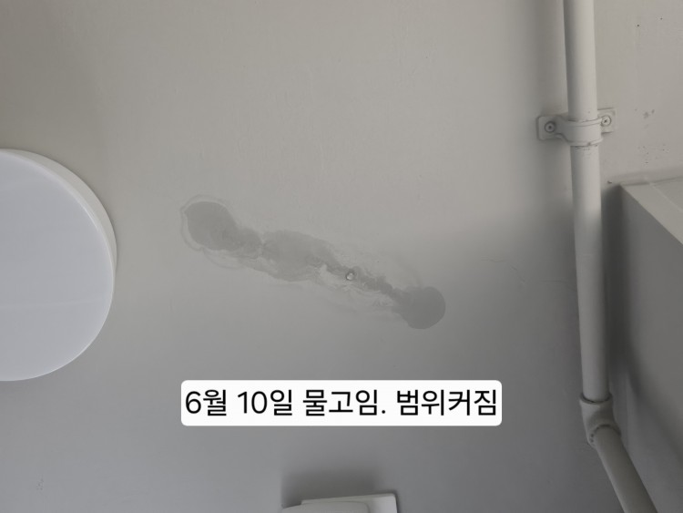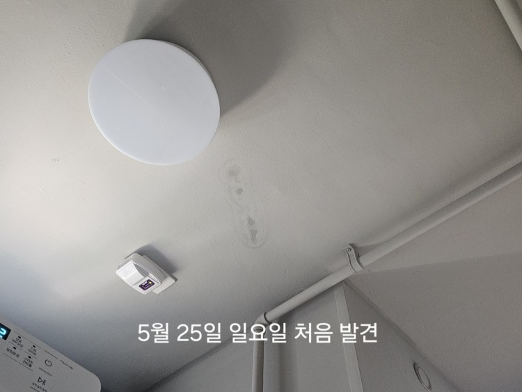 사진과 같이 최근에 발견되었고 현재는 퍼지고 있는 상태로 배관은 3년차에 하자기간이 끝나 윗집과 해결해야하고