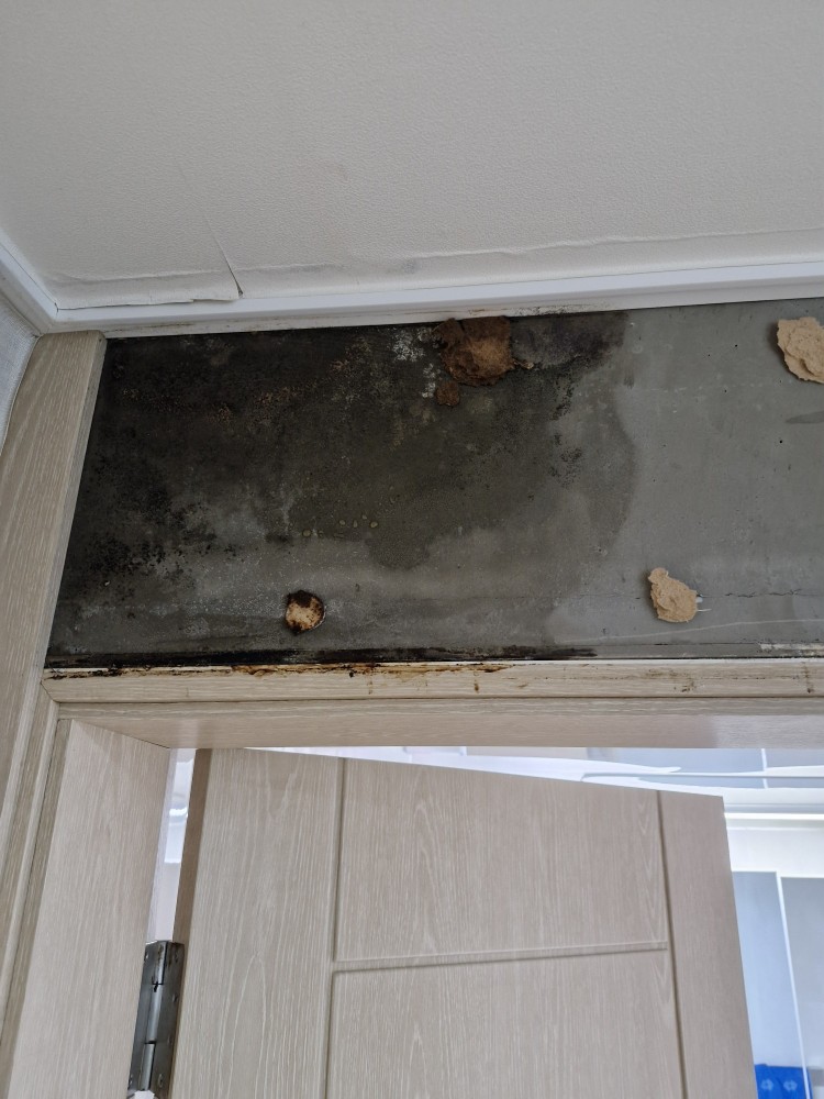 3개월전  거실 화장실 들어가는 입구 천장쪽에서부터 모서리를 타고 물이 흐르는 현상을 발견 했습니다.