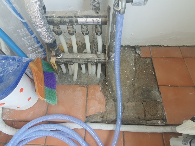 분배기에서 바닥으로 배관이 들어가는 몰탈 부분에 물이 들어가며 아래층에 누수가 발생했습니다.