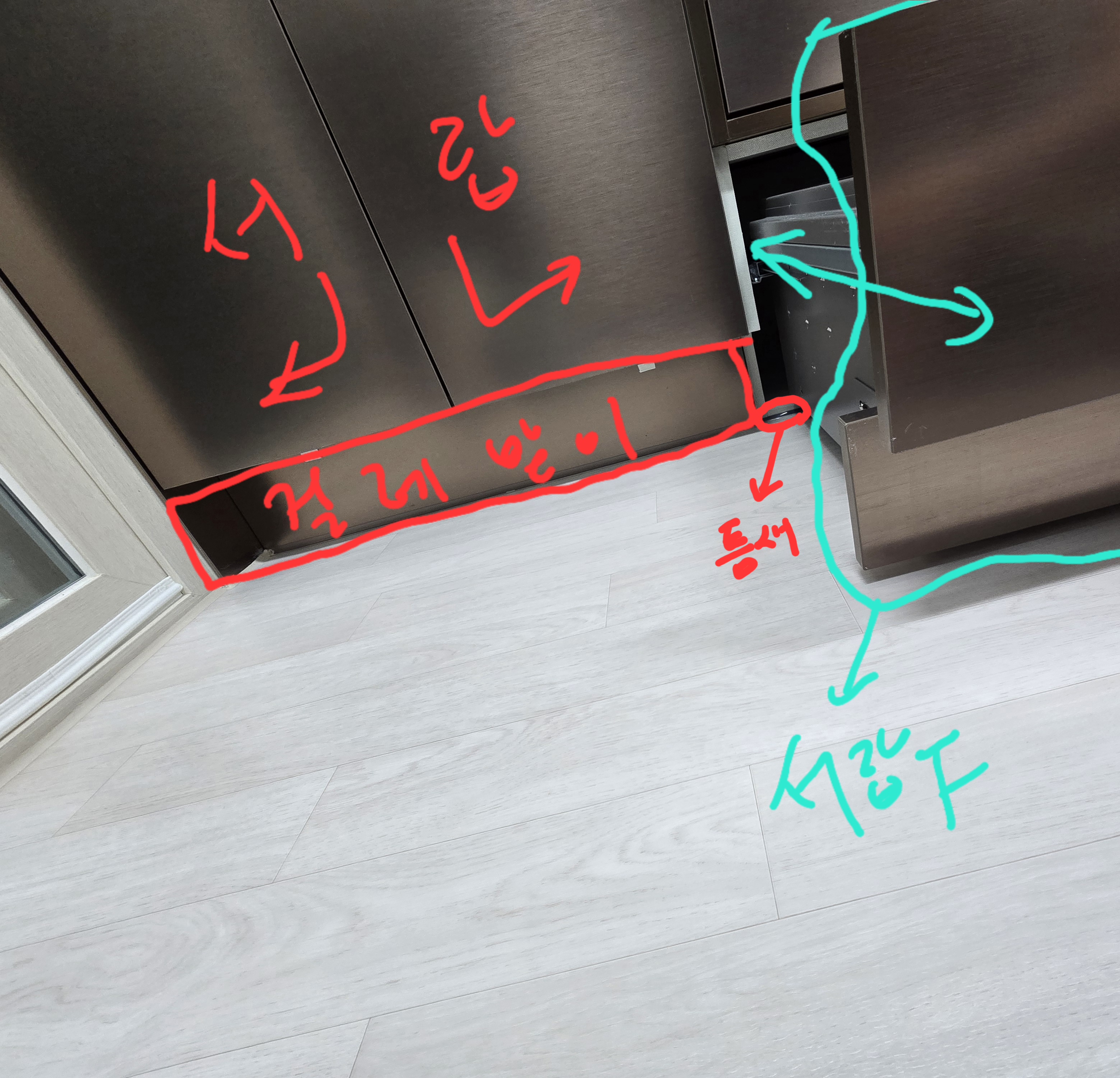 오른쪽 밥솥있는 수납장 하단부 마감 람바와 륨카펫 과는 약 10mm의 틈새가 잇어서 그리로 이물질이 모조리 들어갑니다.(제가 그린 그림에는 람바 밑의 륨카펫이 시공되어있지 않은 맨바닥인 시멘트까지의 틈새표시로 20mm로 표기함)