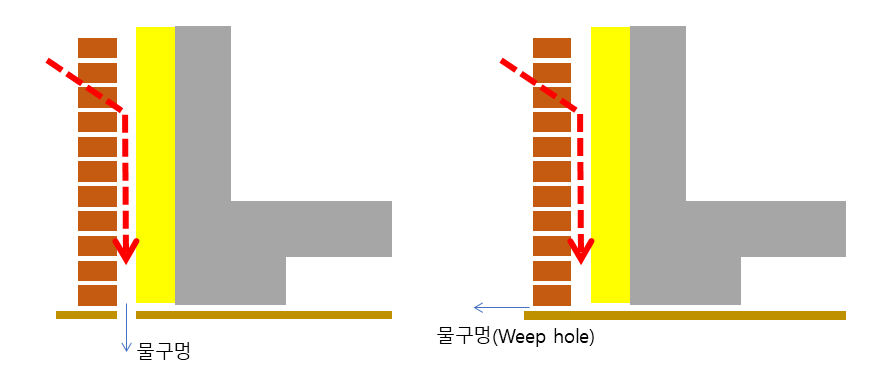 벽돌 뒤로는 항상 물이 넘어갈 수 있다는 것을 전제로.. 그 물을 뺄 수 있는 물구멍이 존재 해야 한다는 의미입니다.